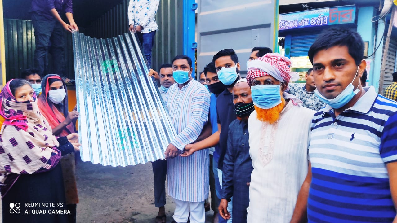 ম্যাফ স্যুজ লিমিটেডের অর্থায়নে অগ্নিকাণ্ডে ক্ষতিগ্রস্ত পরিবারের হাতে ঢেউটিন তুলে দিচ্ছেন কাউন্সিলর মোরশেদ আলম।